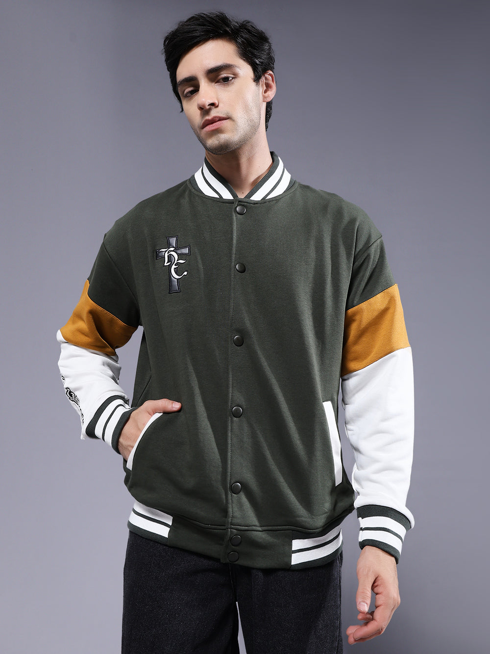 Step up your casual style with olive color New Century Men Varsity Embroidered Bomber Jacket featuring bold embroidery prints and striped ribbed detailing. Perfect for everyday wear, parties, or street fashion.