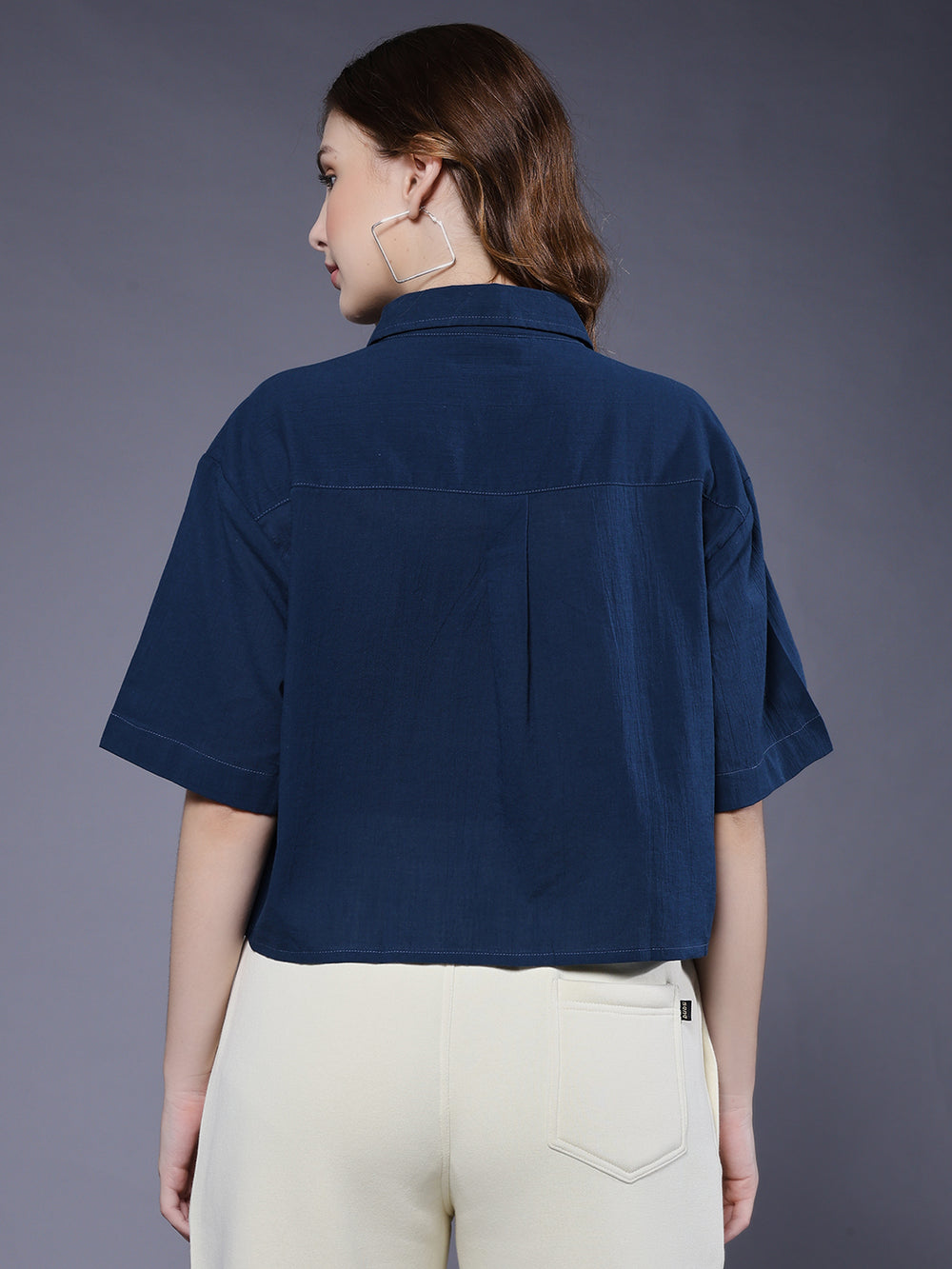 Stylish navy blue crop shirt featuring a clean button-down design and dual front pockets. Its relaxed fit and soft fabric make it perfect for casual outings or everyday wear.