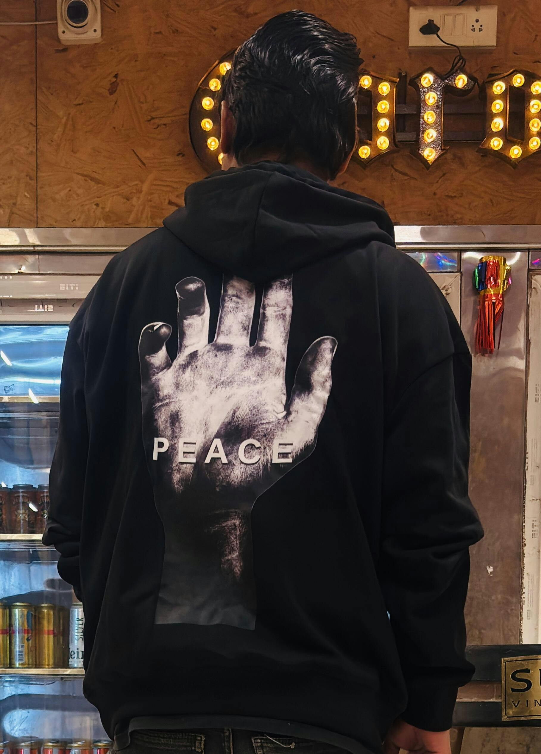 Shop black color peace men drop shoulder premium terry hoodie online from Pronk. Available in S, M, L, XL sizes. Check out vast collection of hoodies at our website. Explore trendy design from Pronk.