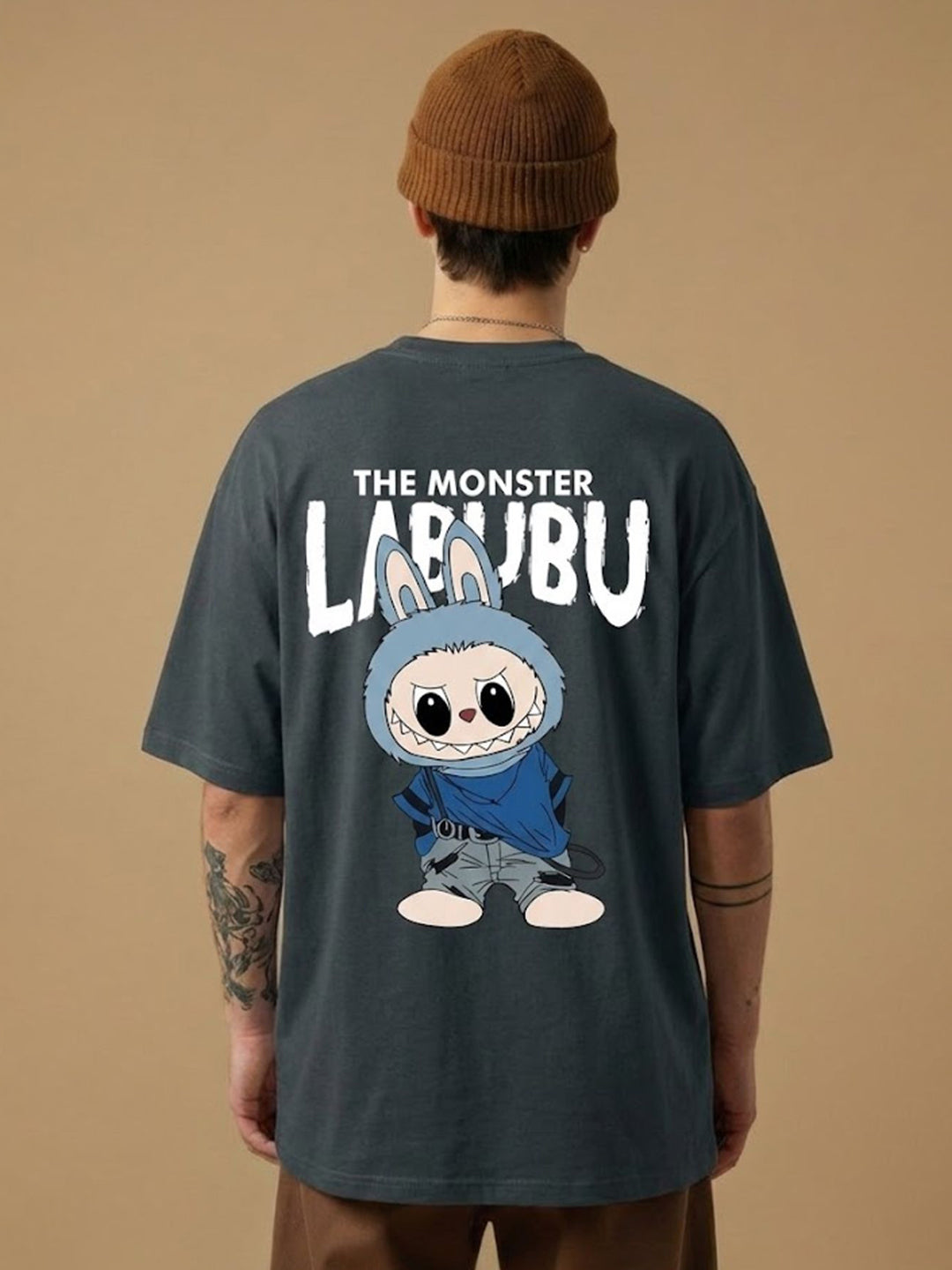 Dark Grey oversized t-shirt with “THE MONSTER LABUBU” text and a fun cartoon print on the back. Soft and comfortable fabric perfect for casual wear.