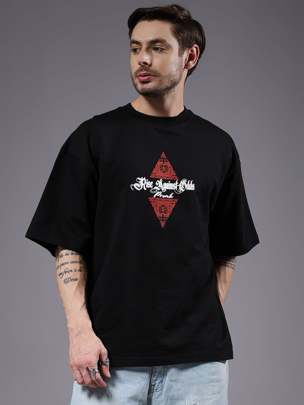 Get the premium quality Men's Oversized T-Shirt with Rise Against Odds Design in black from Pronk. Available in XS, S, M, L, and XL sizes. Explore a wide range of stylish men's topwear. Designed for exceptional comfort and a bold look, making it perfect for casual wear. Shop now!