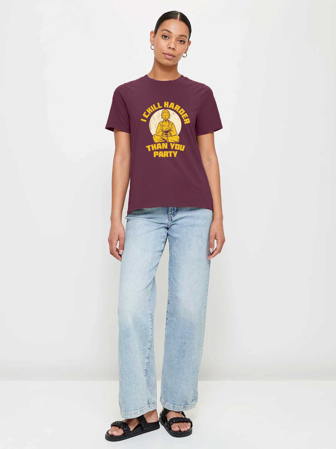 Get premium quality wine color i chill harder than you party women half sleeve t-shirt online from PRONK. Available in XS to XXL size. Buy online now!