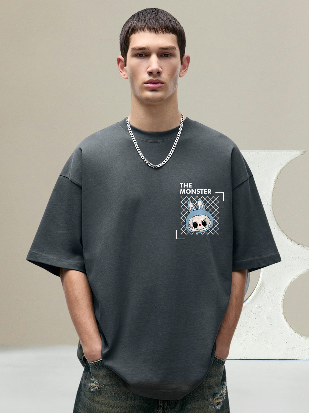 Dark Grey oversized t-shirt with “THE MONSTER LABUBU” text and a fun cartoon print on the back. Soft and comfortable fabric perfect for casual wear.